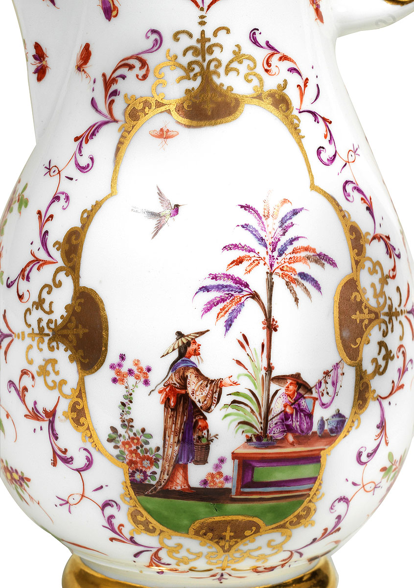 Was aber als Erstes auffällt, sind die Malereien auf der Kanne. Sie stammen von einem der berühmtesten Maler der Porzellankunst: von Johann Gregorius Höroldt. Wer einmal seine chinesischen Fantasiegestalten gesehen hat, wird seine Meisterwerke in jeder Sammlung wiedererkennen. Höroldt bannte märchenhafte Szenen auf die Wölbungen der Gefäße, fantastische Bilder aus einem China, wie man es aus den Schilderungen der Händler, Entdecker und Missionare kannte. Die perfekte Ergänzung sind die Blüten– auch sie sind exotisch, sogenannte „indianische“ Blumen, und kleine Insekten. „Chinoiserie“ nennt man die Mode, die über Jahrhunderte zu Meisterwerken der Kunst führte, inspiriert vom Bild exotischer Kulturen. „Da wird die wunderbare Kanne sicher eine Rolle im nächsten Jahr spielen, wenn es bei uns im Themenjahr 2021 um Exotik geht“, erklärt Konservatorin Petra Pechaček.
