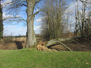Der erste Eindruck war allerdings dramatisch: Am oberen Weiher war eine große Eiche auseinandergebrochen. Der Baum stand allerdings direkt am Krebsbach und der abbrechende Teil der Eiche fiel in Richtung Bach, so dass keine Gefahr für Passanten bestand. In der Fichtenallee bei der Eremitage betraf es einen Baum; die Fichte fiel allerdings so, dass sie ihre Nachbarfichten nicht schädigte. Weitere Opfer des Sturmtiefs sind fünf Eschen im angrenzenden Wald. Nach der eingehenden Inspektion am Montag war für die Schlossgärtner auch klar, dass keine losen Bruchäste mehr in den Bäumen hängen. In den nächsten Tagen werden nun noch die Sturmschäden aufgearbeitet. Die Wege im Schlossgarten von Schloss Favorite sind bereits freigeräumt.