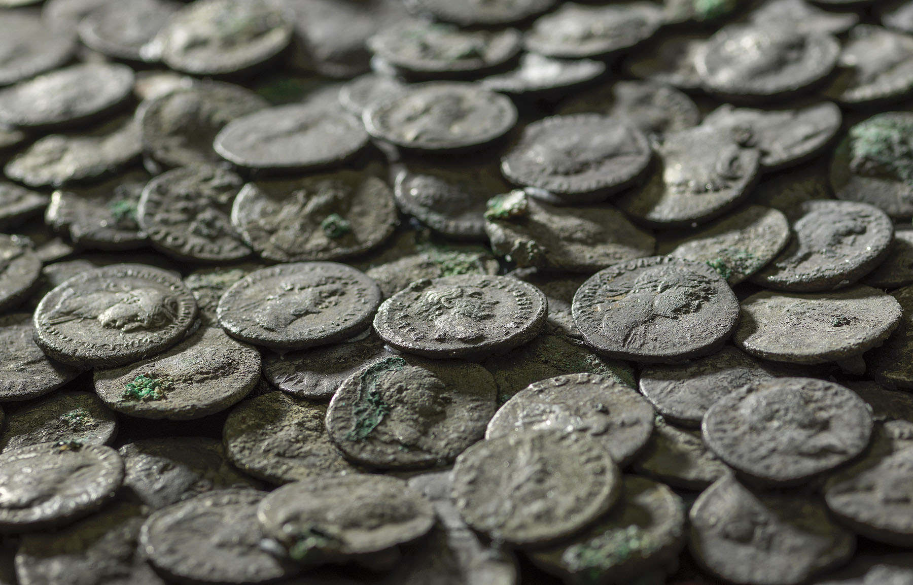 Die knapp 5600 Silbermünzen sind mit ihren etwa 15 Kilogramm Gewicht der größte je gefundene Silberschatz im heutigen Bayern. Fotos: Andreas Brücklmair/Kunstsammlungen & Museen Augsburg (oben), Monika Harrer / Kunstsammlungen & Museen Augsburg (Mitte)