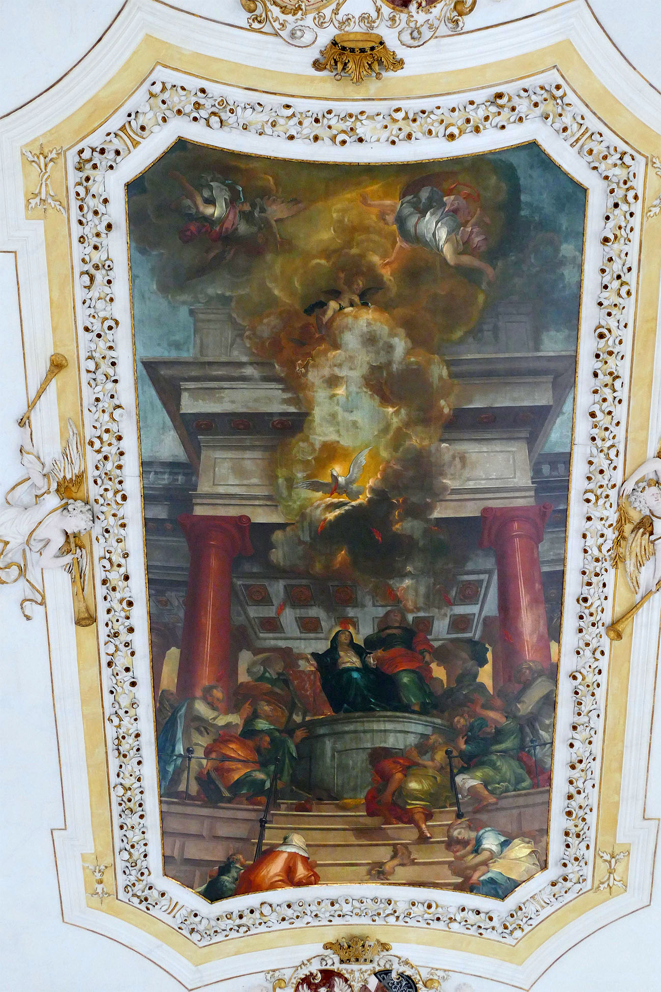Nicht nur die Wände des Kaisersaals, sondern auch die Decke ist prächtig ausgestaltet. Das Zentrum ist von drei großformatigen Gemälden geprägt, die zwischen 1708 und 1713 von Franz Carl Stauder (um 1660-1714) geschaffen wurden: Daniel in der Löwengrube, Elias im Feuerwagen und in der Mitte das Pfingstwunder. Es ist ein ausdrucksstarkes Bild: Unter einer mächtigen Architektur steht Maria, umgeben von elf Aposteln; nur Thomas fehlt. Über ihnen breitet sich eine finstere Wolke aus, von innen ein Licht freigebend, aus dem der Heilige Geist als Taube hervorkommt. Ausgehend von diesem beginnen sich die flackernden Flammen auf die Köpfe der Apostel zu setzten. In den bewegten Körperhaltungen und Gesichtern der Apostel erkennt man, wie emotional, aber auch furchterregend dieser Moment ist. Maria jedoch hält die Hände erwartend ausgebreitet, während der neben ihr stehende Apostel bereits vom Heiligen Geist erfüllt ist; seine innig auf die Brust gelegte Hand und der nach oben gerichtete Blick lässt seine Hingabe zu Gott erkennen.