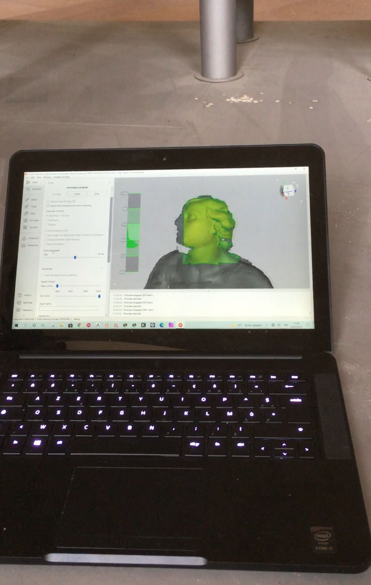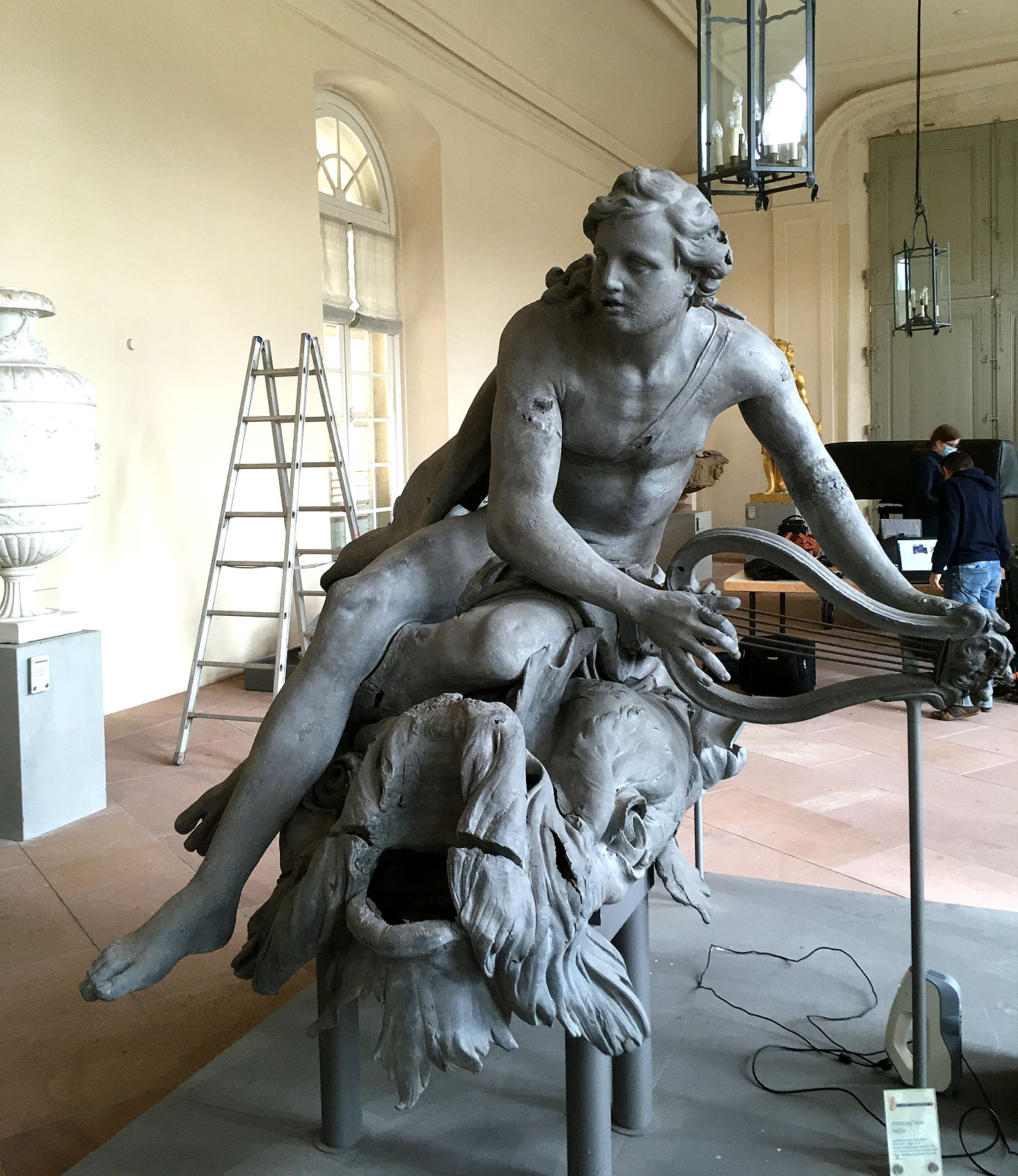 Schlossgarten Schwetzingen: Originalskulptur des Arion im Zirkelsaal des Schlosses, darunter Arbeiten am 3 D-Scan der Figur. Foto: kulturer.be