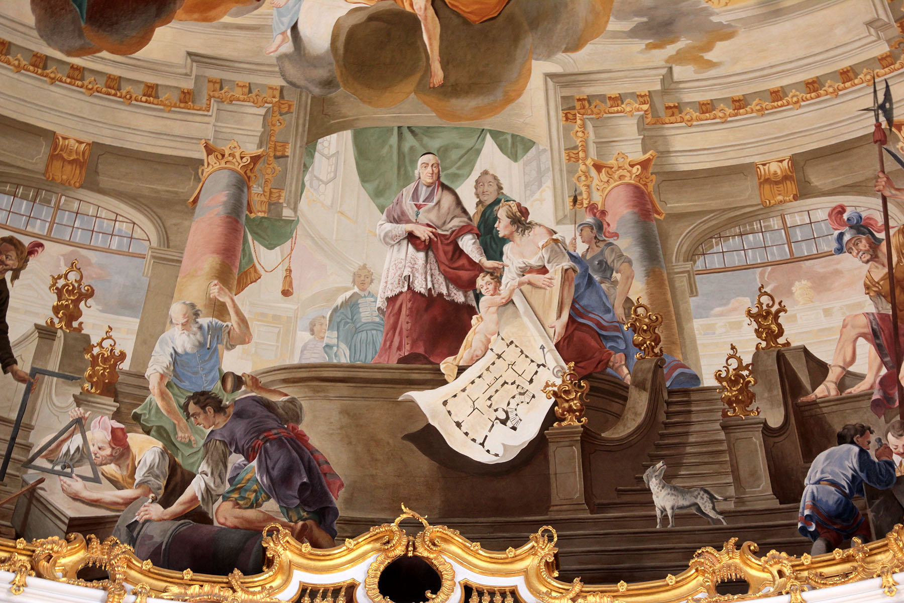 Schloss Bruchsal, Deckenfresko im Kuppelsaal: Der Baumeister präsentiert Fürstbischof Damian Hugo von Schönborn den Bauplan seiner neuen Residenz. Foto: kulturer.be