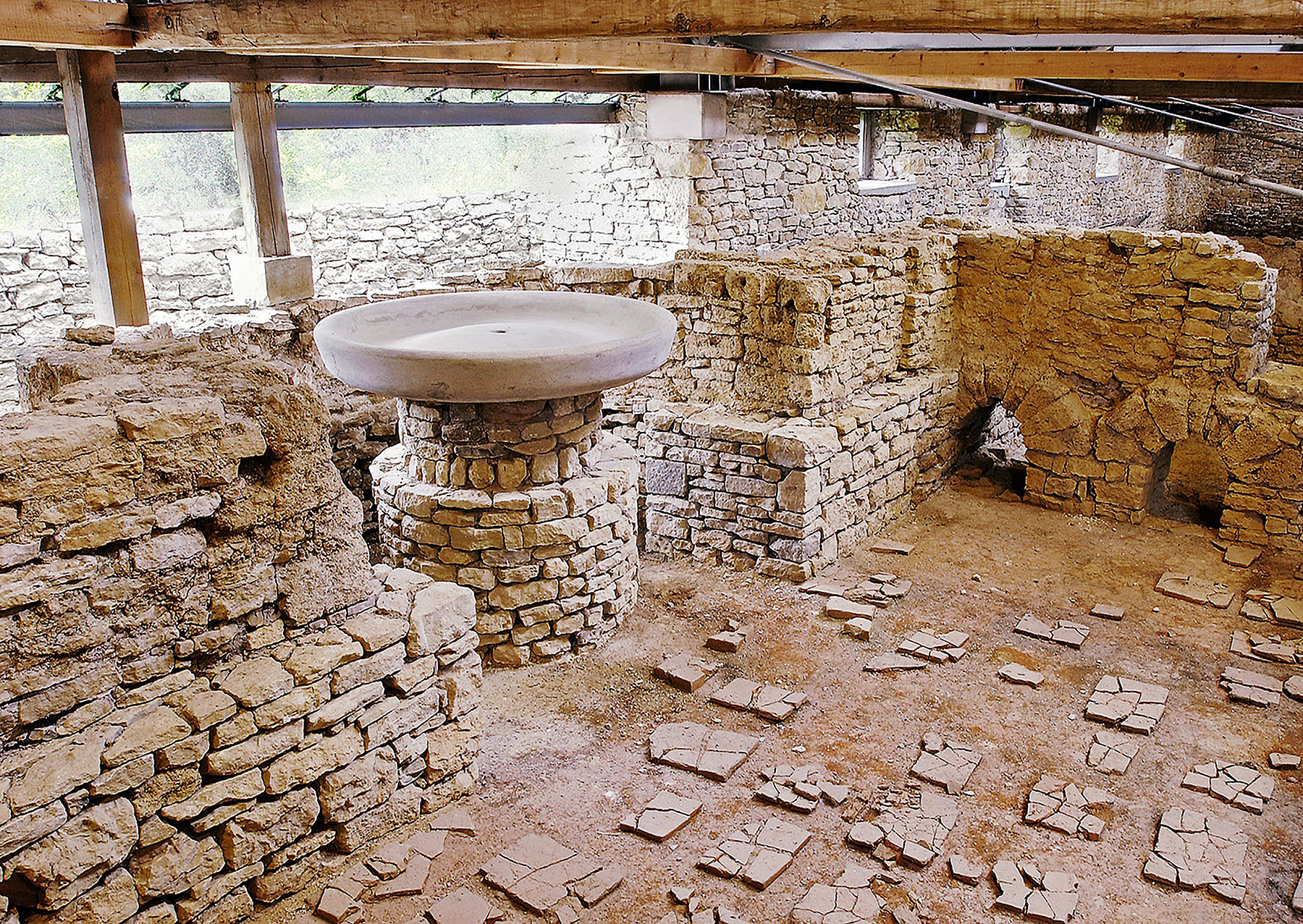 Wo die Römer herrschten, dorthin brachten sie ihre Lebensart. Und so kam die Badekultur des Mittelmeerraums auch ins heutige Deutschland – in Hüfingen lässt sich sie auf rund 570 Quadratmetern entdecken. Auf freitragenden Metallstegen können sich die Besucherinnen und Besucher eine Übersicht über die Ausgrabung und die Badekultur der Römer verschaffen. Die Badruine zeigt ein ausgeklügeltes System: Im östlichen Teil des Gebäudes befand sich der Heizraum. Die Warmluftheizung erwärmte die einzelnen Bereiche des Bades genau – noch immer ist sie gut zu erkennen. Die alten Römer betraten das Bad durch das Apodyterium, den Umkleide- und Ruheraum. Im lauwarmen Tepidarium reinigten sie sich mit Salbölen und Schabern. Danach wechselten sie in den Warmbaderaum. Im Caldarium herrschten 35 Grad Celsius. Ein Kaltwasserbrunnen sorgte für Erfrischung in der Hitze. Der Brunnen mit der großen runden Steinschale ist rekonstruiert – viel Vorstellungskraft ist daher nicht notwendig.