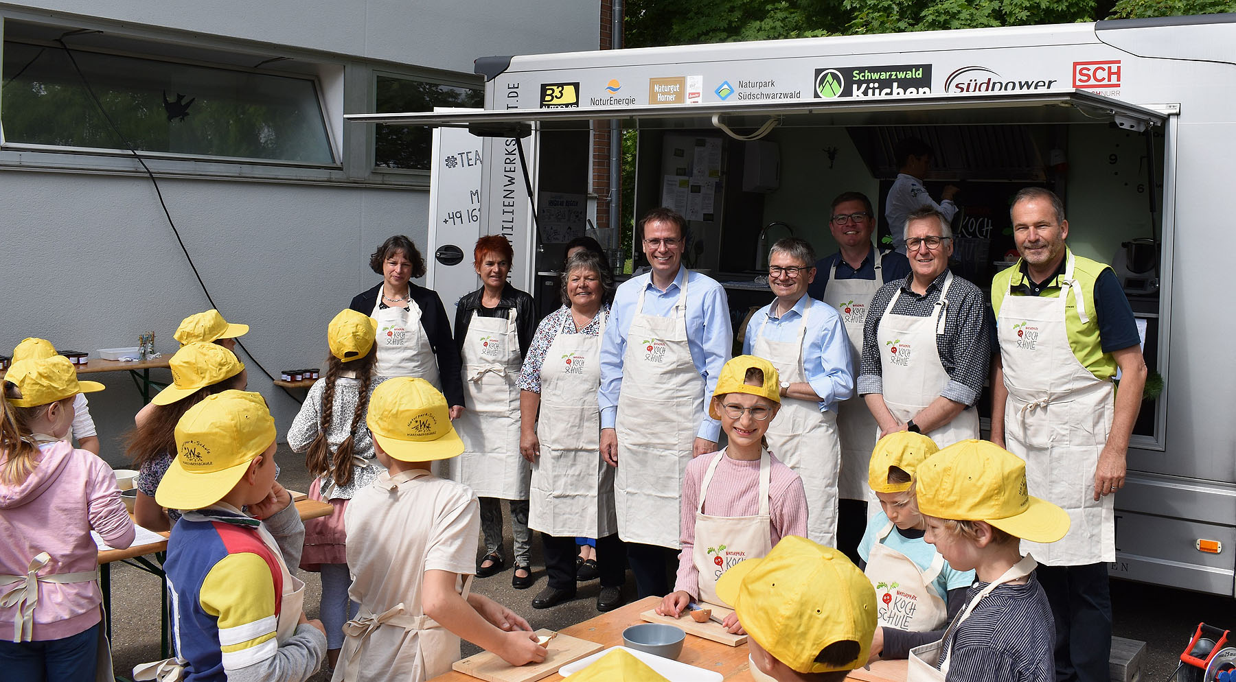 Schürzen anziehen, Hände waschen und los geht‘s: Wenn die Naturpark-Kochschule mit ihrer Küche auf Rädern Naturpark-Schulen oder Naturpark-Kindergärten besucht, ist Action vorprogrammiert. Am 25. Mai war die Warenbergschule an der Reihe, eine von derzeit 53 Naturpark-Schulen in den sieben Naturparken Baden-Württembergs. Auch an diesem Tag sorgte der mobile Kochbus für viele leuchtende Kinderaugen: Das Fahrzeug mit umfassender Küchenausstattung war mit leckeren Rezepten, frischen Lebensmitteln, pfiffigen Lernspielen sowie den nötigen Kochutensilien beladen und hatte somit alles an Bord, was es für einen aktiven Koch-Tag braucht. Während die kleinen Köchinnen und Köche der Klassenstufe 3 bereits fleißig einen leckeren Linsen-Brotaufstrich, saisonales Fruchtketchup und sauer eingelegte Radieschen zubereiteten, überzeugten sich die Gäste von den vielen Qualitäten der örtlichen Naturpark-Schule: Rektorin Ilka Kreilinger führte durch den üppigen Schulgarten und präsentierte liebevoll gestaltete Ernährungs-Module, die im Rahmen des Programms Naturpark-Schule entstanden waren.