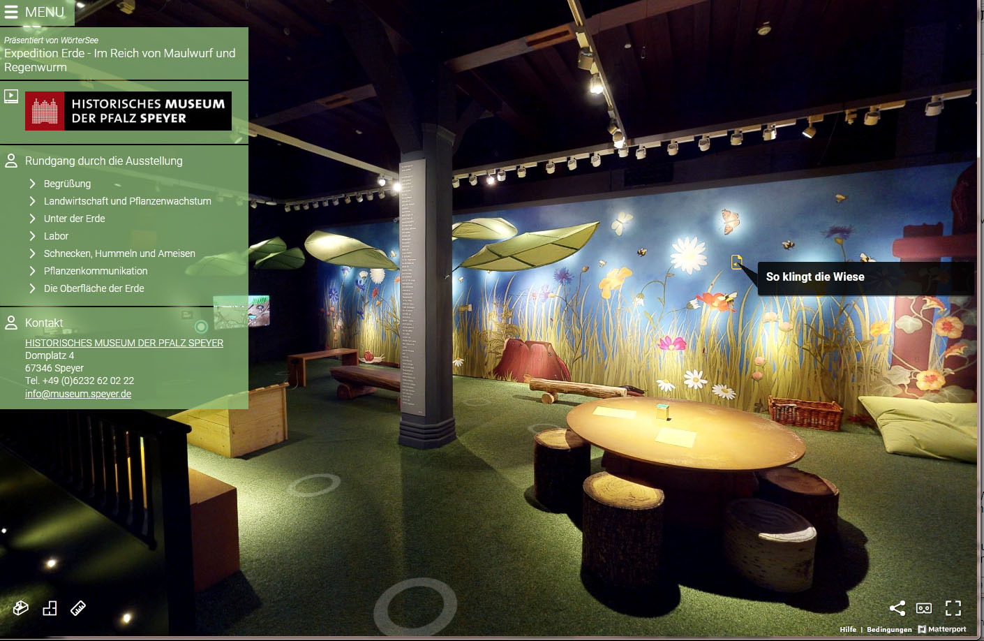 Realisiert wurde das Projekt in Zusammenarbeit mit der Bielefelder Kommunikationsagentur WörterSee auf Basis der Matterport-Technologie, die es ermöglicht, virtuell dreidimensionale „Zwillinge“ von Räumen zu erzeugen. Die Schau im Historischen Museum der Pfalz war unter dem Titel „Expedition Erde. Im Reich von Maulwurf und Regenwurm. Eine Mitmachausstellung des Zoom Kindermuseum Wien“ von Oktober 2021 bis Juni 2022 zu sehen.