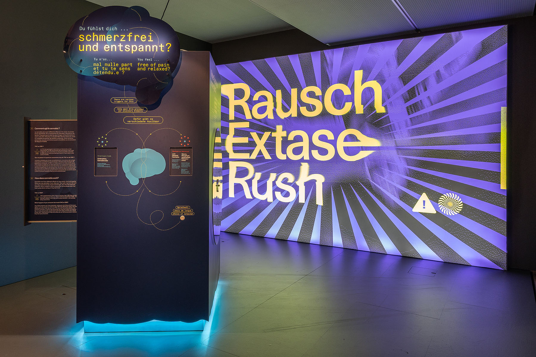 Was genau ist Rausch? Warum streben wir nach ekstatischen Gefühlen und was fasziniert uns so daran? Die Ausstellung untersucht das Phänomen «Rausch» und dessen Auswirkungen. Auf einer multimedialen Reise begegnen die Besucherinnen und Besucher geschichtlichen Hintergründen sowie den Möglichkeiten und Risiken eines Rausches. Dabei ist die grosse Frage, warum unsere Gesellschaft so widersprüchlich mit diesem Phänomen umgeht.