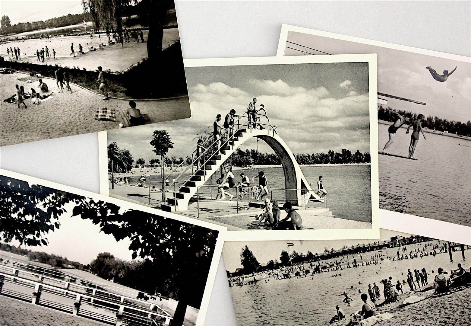 Mit Ansichten aus verschiedenen Jahren zeigen die Postkarten auch teils nicht mehr existente oder stark veränderte Anlagen und geben einen Einblick, wie sich unser Strandbad, aber auch unser Freizeitverhalten, gewandelt hat. Vor den 1930er Jahren fanden sich in der heutigen Anlage lediglich die „Schmidtschen Weiher“ der Ziegelfabrik und der „Siegfriedsbrunnen“. Der erste Spatenstich für das Strandbad erfolgte am 25.Januar 1932. Gechlorte Schwimmbecken gab bis in die 1960er Jahre nicht: Der Badespaß fand im und am Badeweiher neben dem Schwanenweiher statt. Über die Zeit kamen und gingen Rutschbahnen, Sprungtürme, Stege und Startblöcke. Heute ist das Strandbad eine Sport- und Freizeitanlage auf 170.000 Quadratmeter, verfügt über drei Schwimmbecken, einen modernen Kinderbereich, einen Badeweiher, Spielplätze, große Liegewiesen unter Weiden oder auf dem „Monte“ und einen Rundweg mit Barfußpfad.