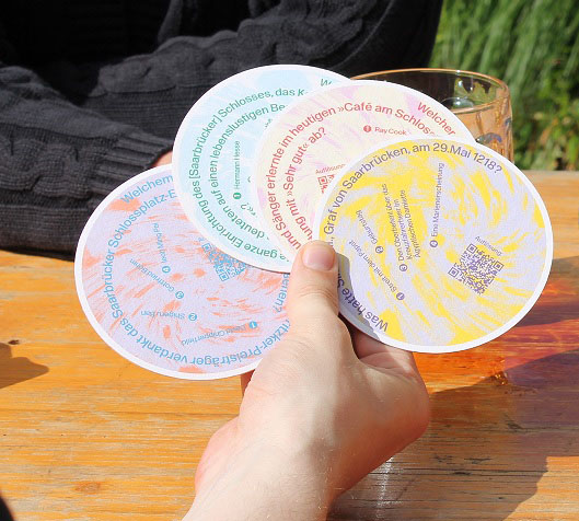 Was haben ein Friedensnobelpreisträger, ein amerikanischer Präsident und Goethe mit dem Saarbrücker Schloss zu tun? Das Historische Museum Saar hat insgesamt 40.000 Bierdeckel herstellen lassen. Die acht Fragen lassen einen abwechslungsreichen Rätselspaß entstehen. Jeweils werden vier Antwortmöglichkeiten angeboten. Ein QR-Code auf den Bierdeckeln führt auf die Homepage des Historischen Museums Saar und gibt die richtige Antwort preis. Auf der Homepage lassen sich die aktuellen Ausstellungen digital erkunden und das weitere Angebot des Museums entdecken.