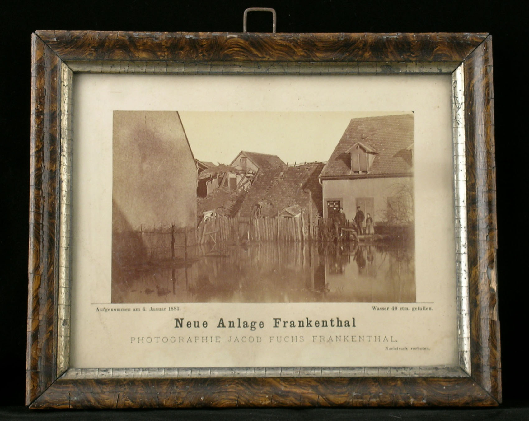 Der Frankenthaler Fotograf Jacob Fuchs dokumentierte am 4. Januar 1883 die Situation in der „Neuen Anlage“, dem Neubaugebiet der Stadt Frankenthal zwischen Kanal und Nürnberger Straße, und vermerkte auf dem Passepartout, dass das Wasser zu diesem Zeitpunkt schon wieder 40 cm gefallen sei. Zwei der abgelichteten Gebäude scheinen auf Grund des Hochwassers eingestürzt zu sein. In Frankenthal mussten nach dem Hochwasser 13 Häuser wiederaufgebaut werden. Damit erlitt es im Gegensatz zu den Dörfern nur einen geringen Schaden.