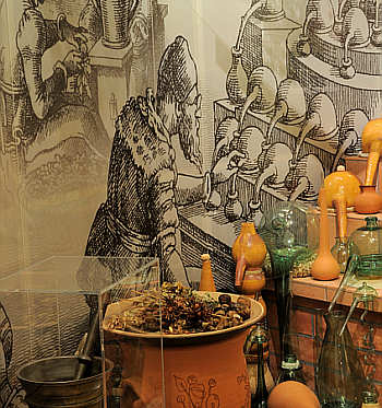 Kelchen und Kolben, mit Pfannen und Tiegeln für alchimistische