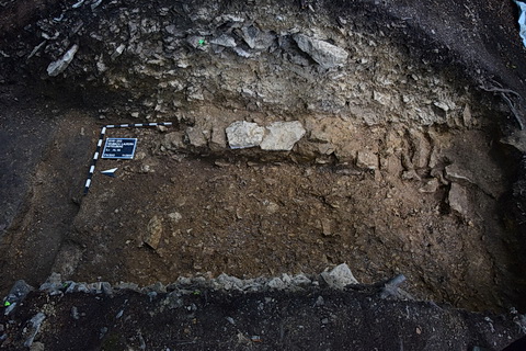 Heubach-Lautern „Mittelberg“: Schnitt durch die Teufelsmauer. An der Profilbasis die aus Steinen gesetzte Substruktion des hölzernen Querankers. Foto: Landesamt für Denkmalpflege im RP Stuttgart