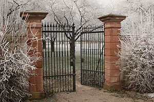 Links: Tor zum Kirschgarten im Raureif. Foto: Uschi Wetzel/ssg