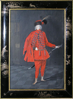 Oben: Markgraf Ludwig Wilhelm von Baden-Baden im Kostüm eines ungarischen Magnaten. Anfang 18. Jh., Schloss Favorite