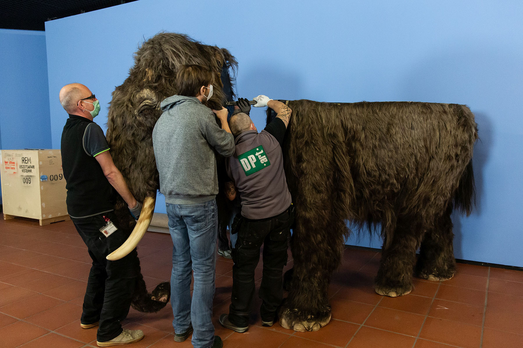 Die lebensechte Rekonstruktion eines Mammuts hat bereits ihren Platz im Museum Weltkulturen eingenommen, während Wollhaarnashorn, Steppenbison und Höhlenlöwe noch in teils riesigen Kisten „schlummern“. Der Aufbau stellt das rem-Team vor logistische Herausforderungen: Die Tiere sind oft so groß, dass sie nicht als Ganzes transportiert werden können, sondern vor Ort zusammengesetzt werden müssen. So reiste auch das Mammut in vier Kisten an. Aus Vorderbeinen, Hinterteil, Rücken und Kopf wuchs Stück für Stück ein weibliches Mammut in Originalgröße heran. Die Mammutkuh ist 2,40 Meter hoch und wiegt ca. 320 Kilogramm. Damit ist sie ein Leichtgewicht im Vergleich zum Original, das bis zu fünf Tonnen auf die Waage brachte.