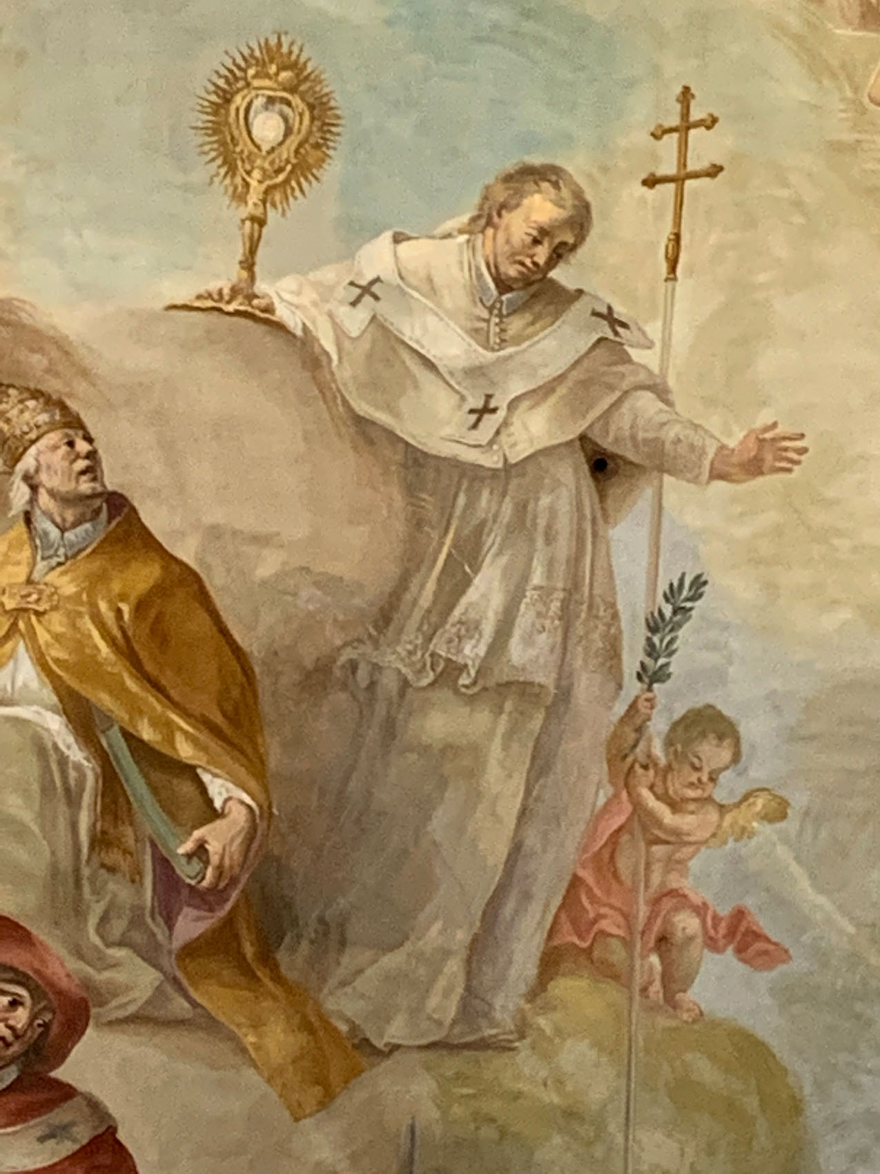 Der 6. Juni ist der Todes- und Namenstag des heiligen Norbert von Xanten. Wer an diesem Tag einen Ausflug ins Kloster Schussenried plant, kann die Gelegenheit nutzen und sich im Kloster auf die Suche nach dem Ordensgründer machen. An mehreren Stellen ist er in Bildern verewigt: In der Klosterkirche St. Magnus etwa zeigt das barocke Deckenfresko Szenen aus seiner Lebensgeschichte. Nochmals taucht er dort im prachtvollen Chorgestühl von 1717 auf, als eine von 24 aufwendig geschnitzten Heiligenfiguren. Erkennbar ist er hier nur durch eine Inschrift – oftmals jedoch trägt er als Merkmale sein weißes Büßergewand, eine Monstranz sowie ein Kreuz mit doppeltem Querbalken. So ist er auch auf dem Deckenfresko im Bibliothekssaal abgebildet – wer genau hinschaut, wird ihn leicht erkennen können.