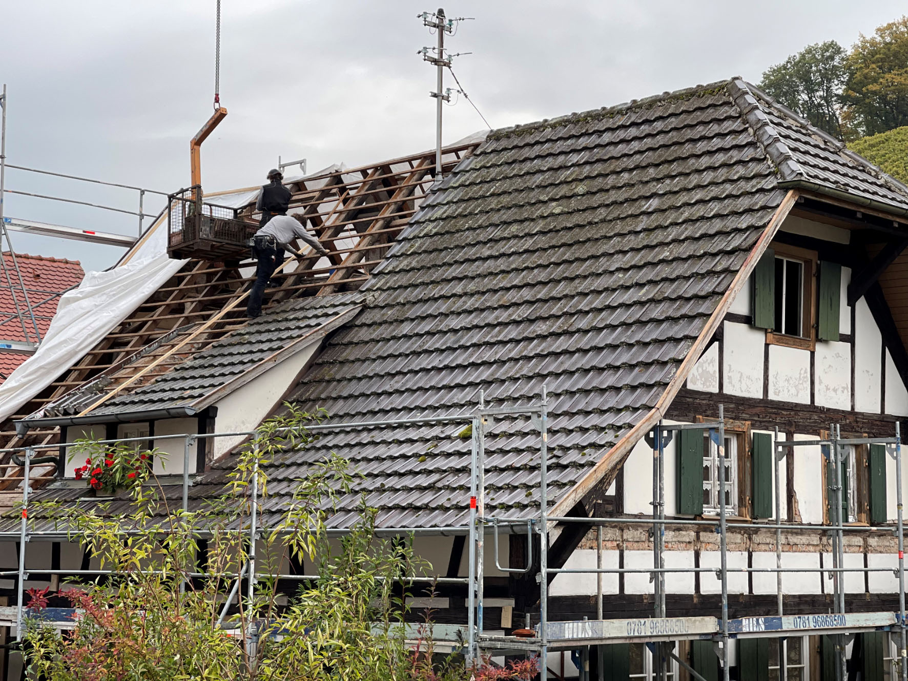 (fmv) Die Arbeiten zur Versetzung des „Ortenauhauses“ von Durbach in das Schwarzwälder Freilichtmuseum Vogtsbauernhof in Gutach sind in vollem Gange. In der vergangenen Woche wurde bereits das komplette Dach des Rebhauses abgedeckt.