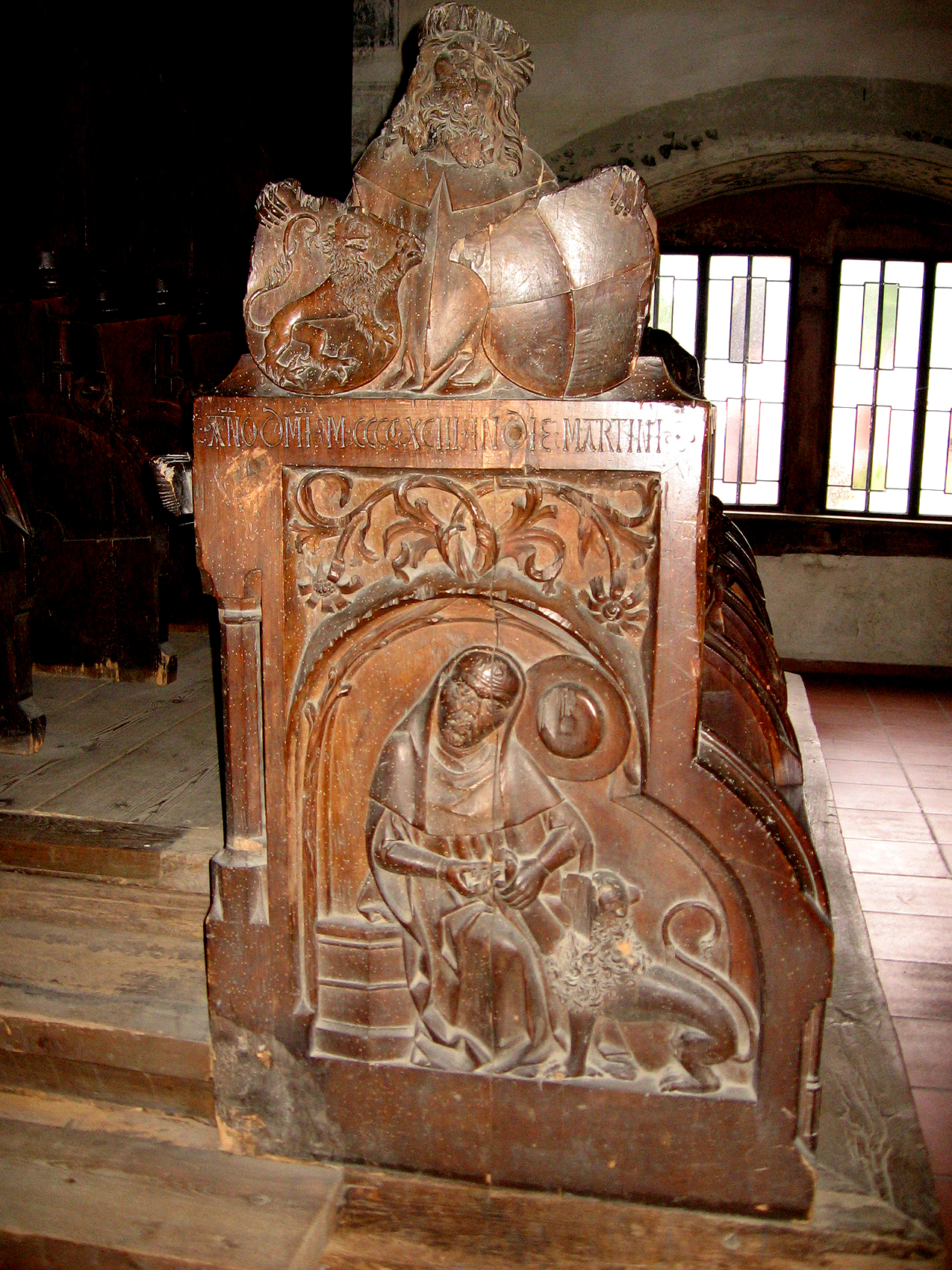 Kloster Alpirsbach, Seitenwange des Chorgestühls mit Samson in der Löwengrube.